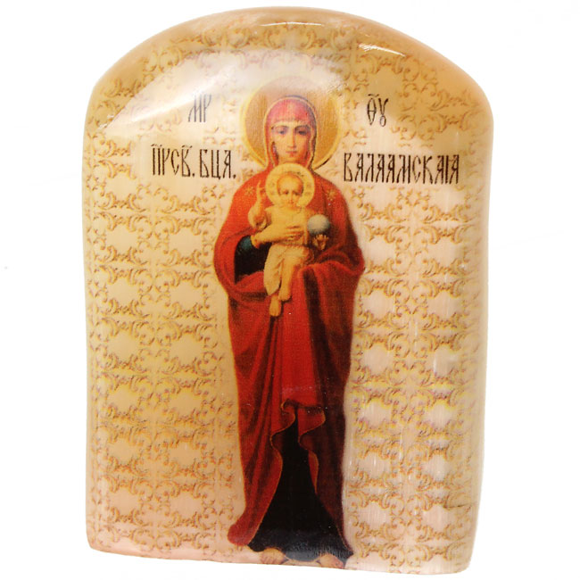 Икона настольная на подставке выполнена путем технологии фотопечати на камне под лаком.