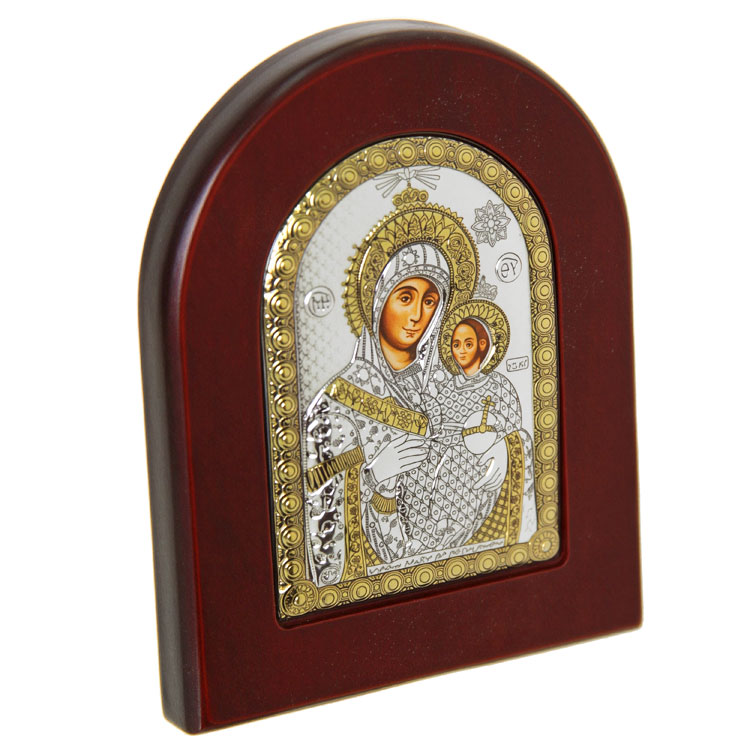 Икона Божией Матери «Вифлеемская», выполнена в стиле греческого письма, ручной работы. Изготовлена с использованием метода шелкографии, а также трафаретной объемной печати. Металлическая пластина состоит из листа алюминия (он получает поверхностную обработку с помощью PVD технологии нанесения тонкого слоя серебра и золота) и покрыта лаком. На обратной стороне иконы имеется подставка и сертификат о подлинности письма.