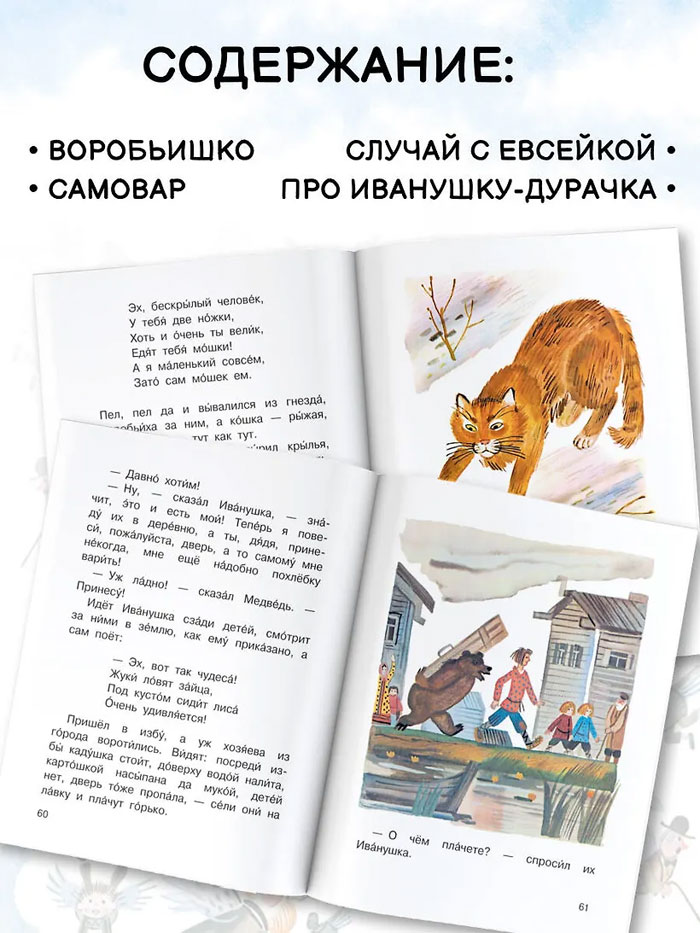 В книгу вошли поучительные и добрые сказки известного писателя Максима Горького: «Воробьишко», «Самовар», «Случай с Евсейкой», «Иванушка-дурачок». Ребята познакомятся с непоседливым воробьишкой, узнают, почему вредно хвастаться, как стать смелыми, решительными и добрыми. Крупные буквы и ударения позволят малышам самостоятельно познакомиться с этими произведениями.