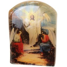 Икона настольная на подставке выполнена путем технологии фотопечати на камне под лаком.