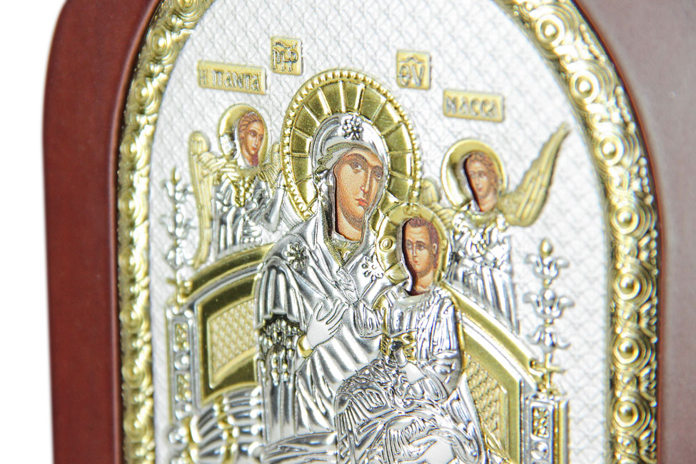 Икона Божией Матери «Всецарица» ручной работы. Лик иконы изготавливается полностью, включая рисунок иконы под окладом. Используется метод шелкографии, а также трафаретной объемной печати. Металлическая пластина состоит из листа алюминия (он получает поверхностную обработку с помощью PVD технологии нанесения тонкого слоя серебра и золота) и покрыта лаком. На обратной стороне иконы имеется сертификат в виде наклейки. Икона имеет ножку-подставку и отверстие для крепления к стене.