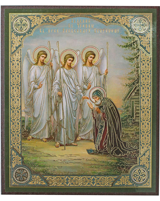 Явление Святой Троицы Александру Свирскому икона на МДФ (10,3 х 12,3 см)