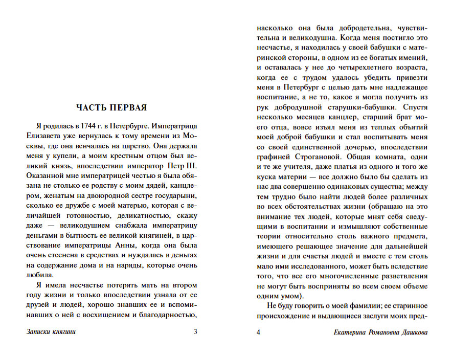 Екатерина Романовна Дашкова, урожденная Воронцова (1743-1810) – одна из самых знаменитых русских женщин XVIII века. Подруга Екатерины Великой, глава двух академий, княгиня оставила яркий след как в культуре, так и в политике. Она принимала участие в дворцовом перевороте в пользу своей царственной приятельницы, много путешествовала по странам Западной Европы, завела знакомства с известными умами своего времени – Дени Дидро, Бенджамином Франклином, Адамом Смитом. И, наконец, написала свои мемуары – знаменитые «Записки». В «Записках» имеются ценные сведения о времени царствования Петра III, о воцарении Екатерины II и роли Дашковой в перевороте, о полной интриг придворной жизни, подробности десятилетнего скитания княгини по Европе, зарисовки московского быта середины XVIII в., характеристики известных русских и европейских деятелей, с которыми автора мемуаров сталкивала судьба.