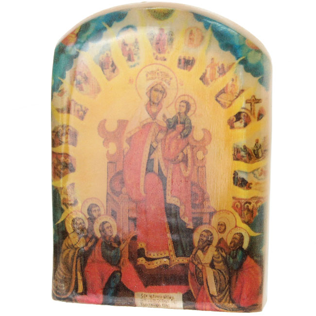 Икона настольная на подставке выполнена путем технологии фотопечати на камне под лаком.